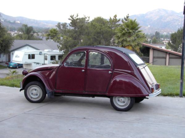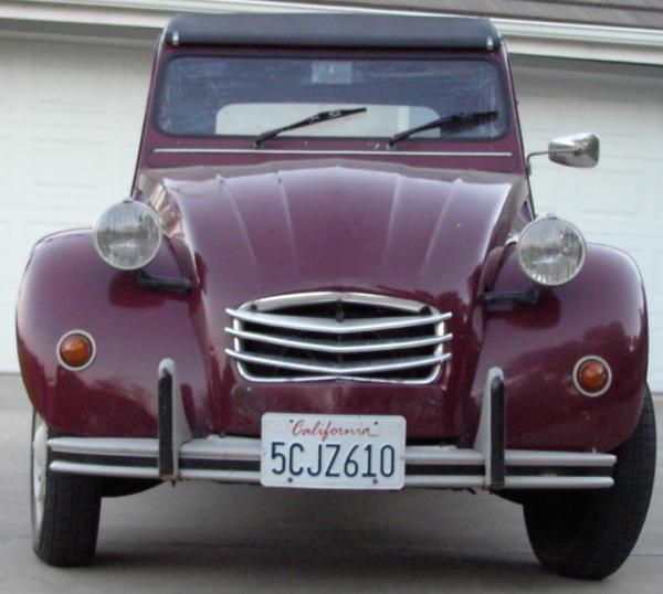 The 2CV, also known as our Ducky Car, sports two cylinders, 602 cubic centimeters engine displacement, air-cooled boxer engine, headlights adjustable from within, and a roof that opens.